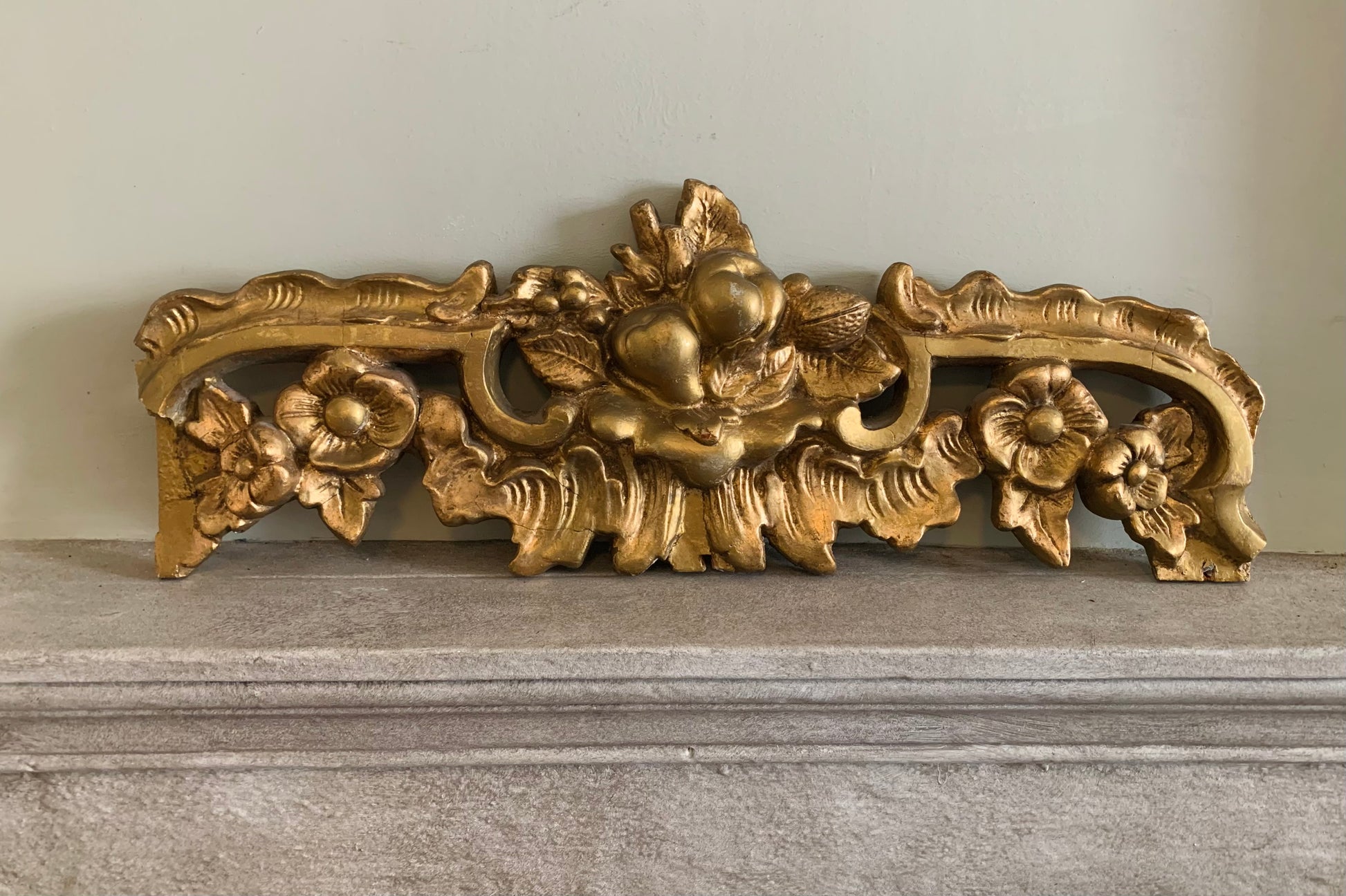 Decorative gilt wood piece showcasing intricate carvings of fruits.