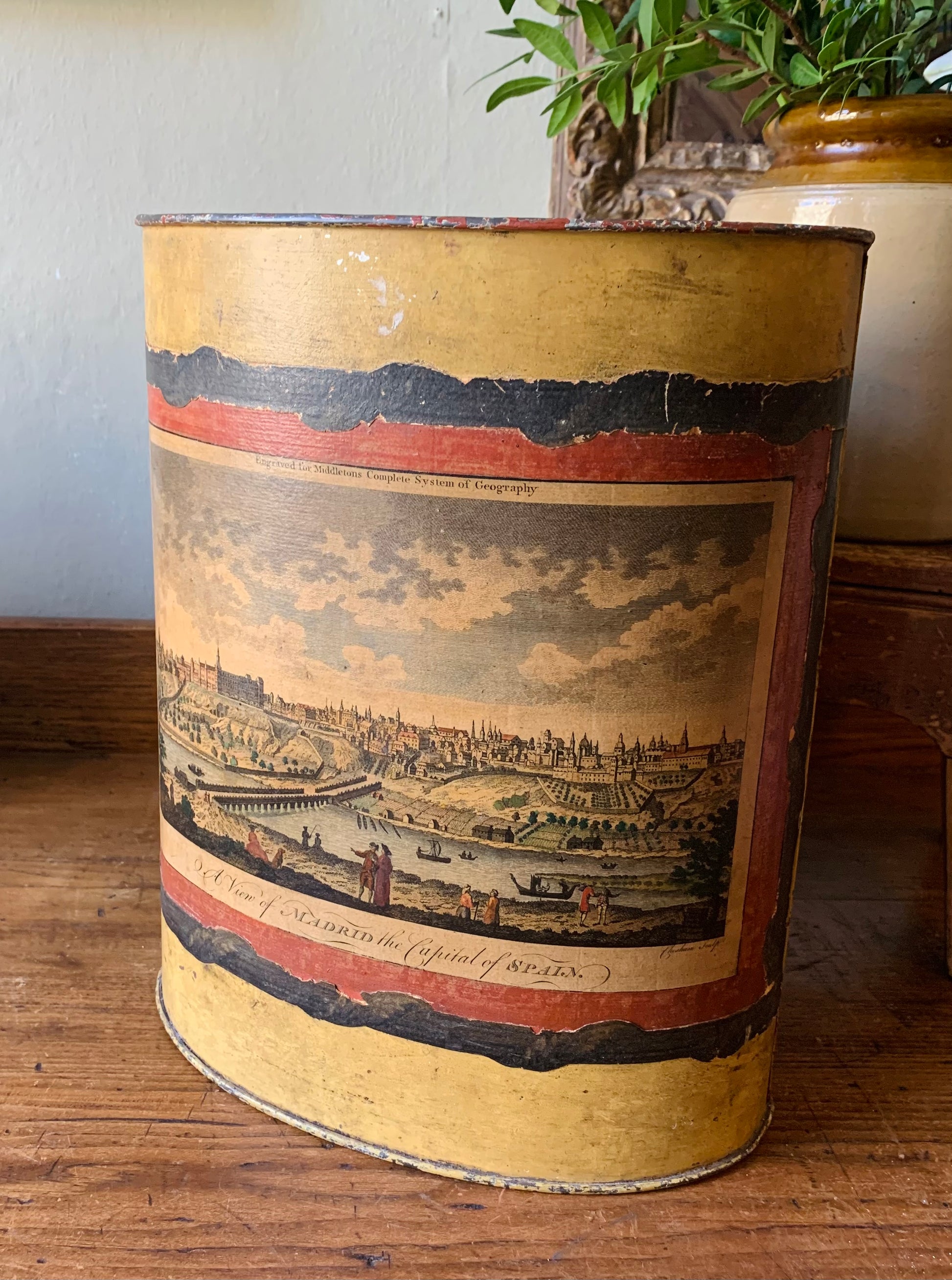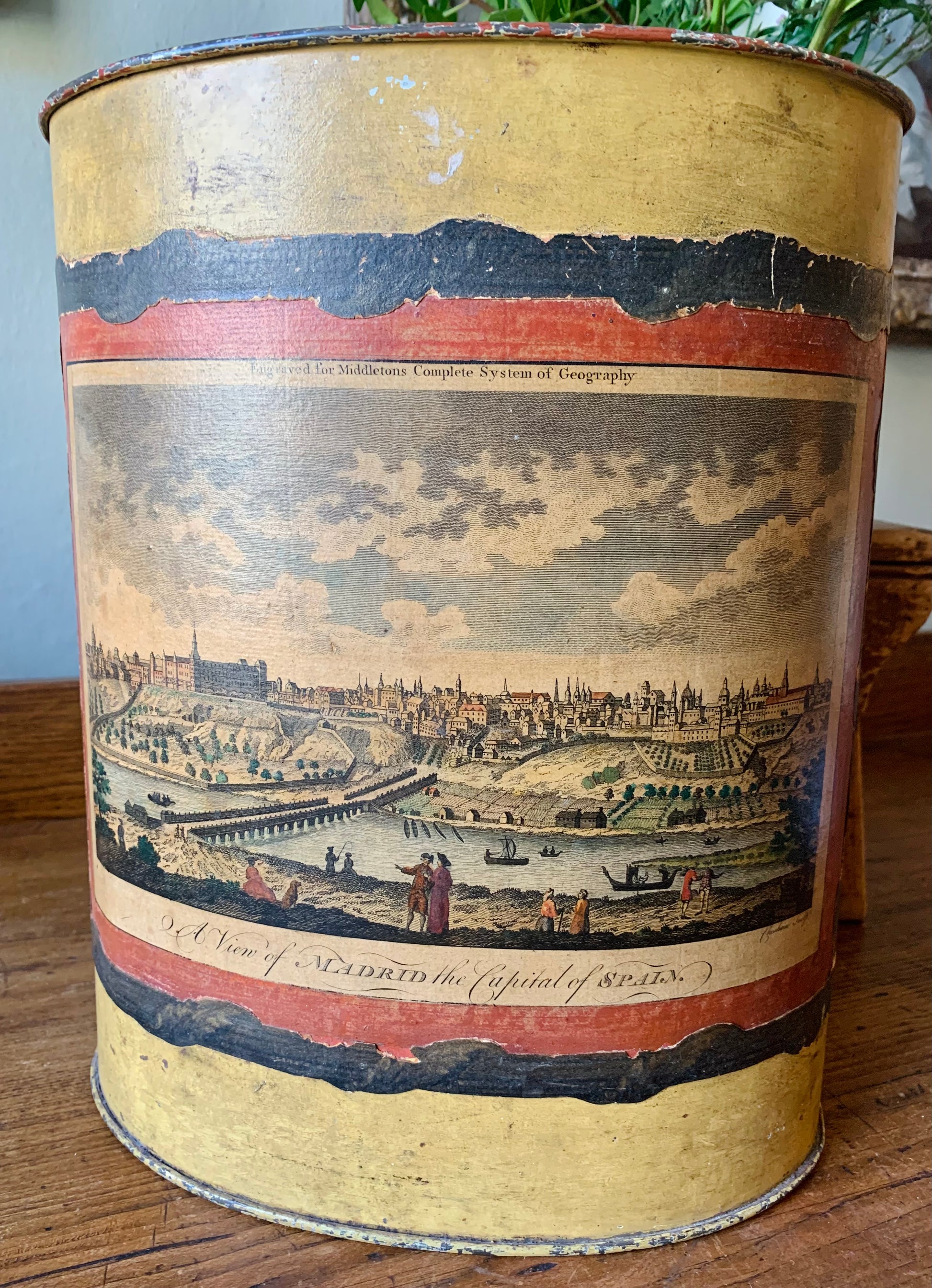 A decoupage wastepaper bin featuring a printed design of Madrid.