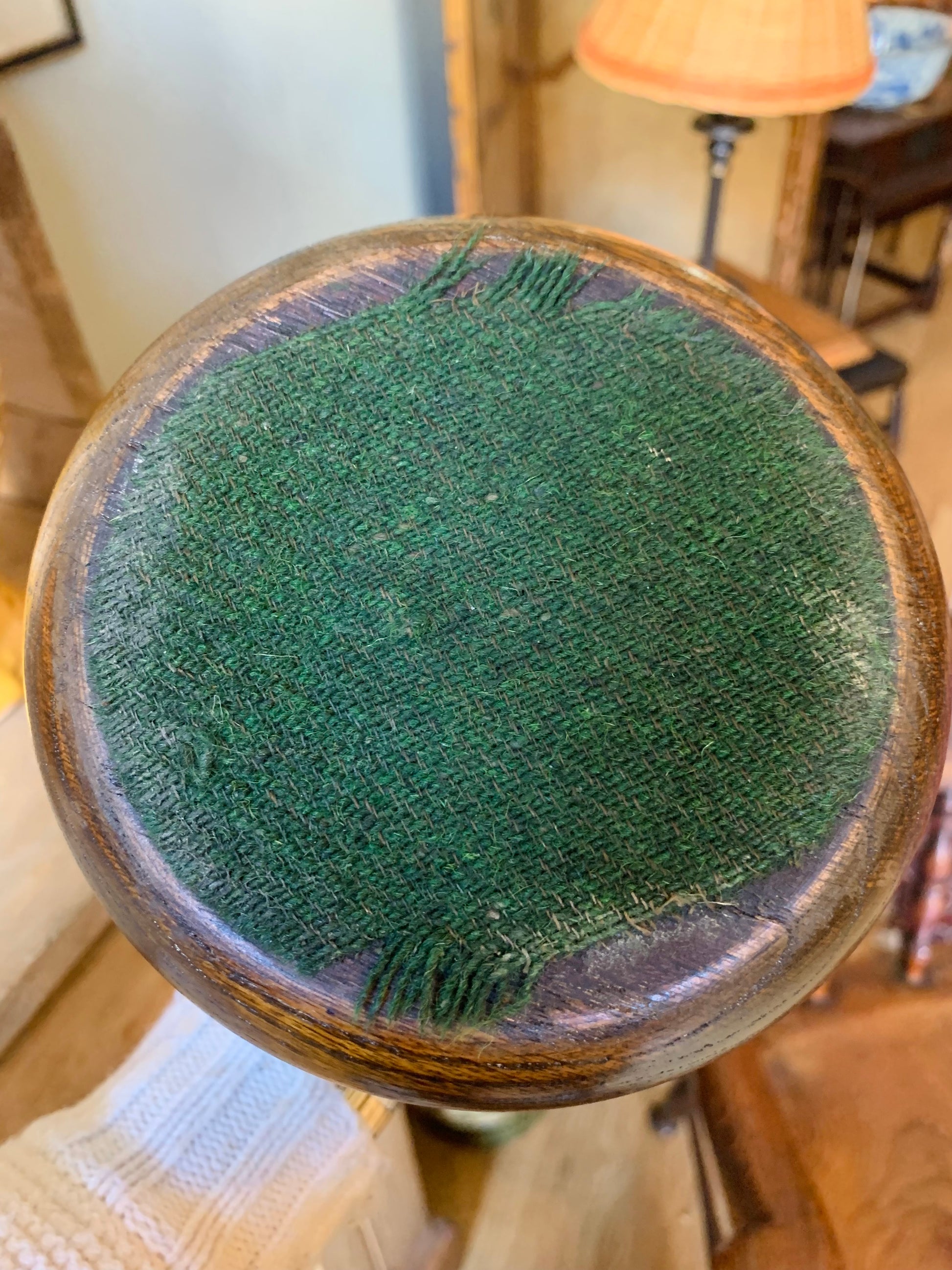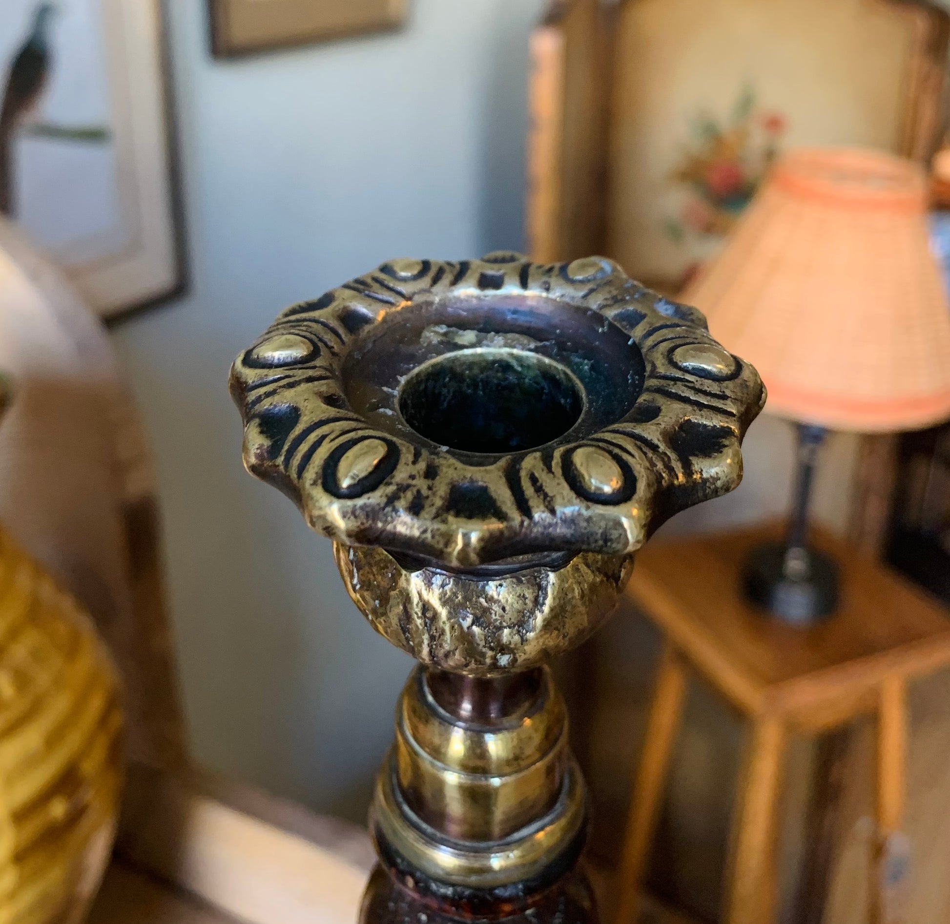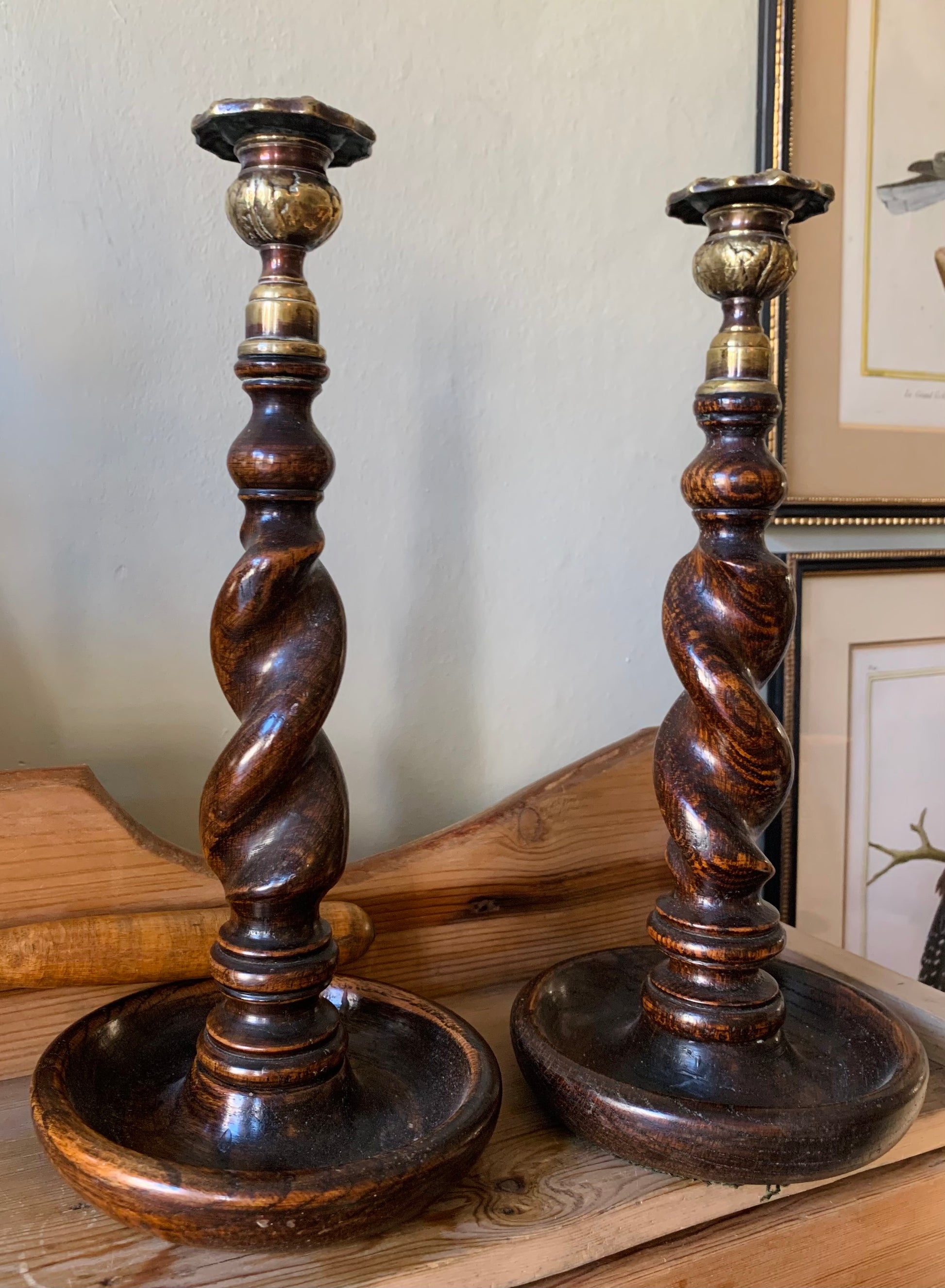 Elegant oak barley twist candlesticks, featuring brass tops.